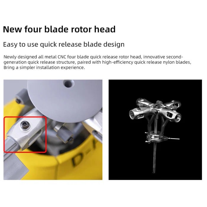 Features an all-metal CNC 4-blade quick-release rotor head with a second-generation detachable design for easy setup. The high-efficiency nylon blades are designed for quick installation and removal, saving time while ensuring structural integrity.